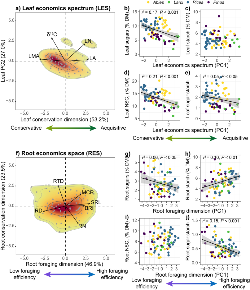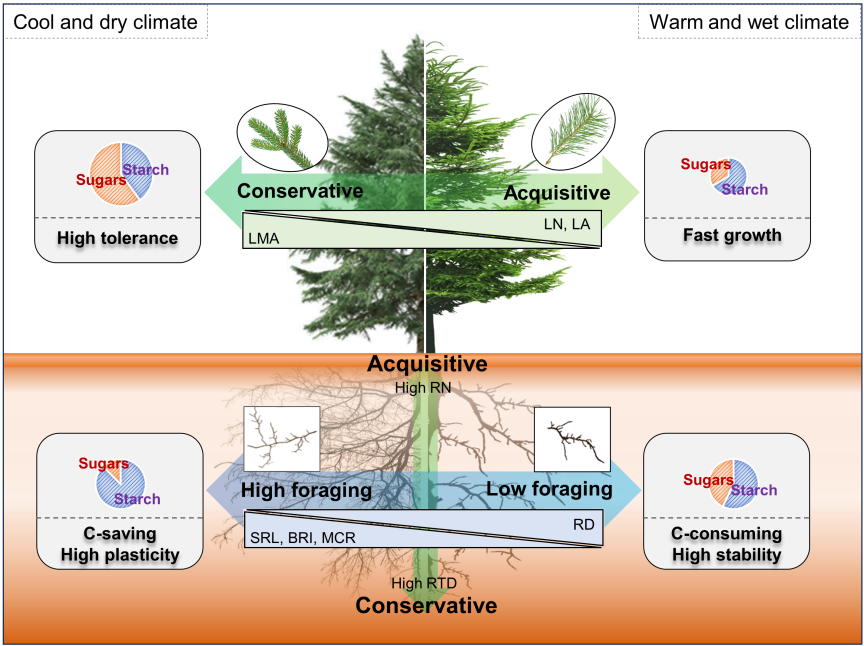 基于此,中国科学院成都生物研究所尹华军研究员团队与河南农业大学孔德良教授合作,以青藏高原高寒森林代表性针叶树种为对象(图1),通过分析叶片和细根关键功能性状、非结构性碳水化合物含量及环境因子,基于目前广泛认知的叶经济谱和根系经济空间策略框架,系统探讨了NSC与植物地上-地下经济策略间的协调关系差异及其关键环境驱动因子。研究结果表明,叶片和根系存在差异化的NSC-经济策略协调关系(图2,3)。具体地,在地上,叶片NSC含量,尤其是可溶性糖的储存,与叶经济谱的资源保守端相对应,并主要受到气温与降雨所驱动,体现了植物生长速率与低温、干旱耐受性之间的权衡。而令人意外的是,在地下,根系NSC的变化独立于细根经济谱,而NSC中两个主要组分——糖和淀粉与根系觅食维度呈现相反的协调关系,并主要由降雨所驱动,即随着降雨量减少,根系觅食效率增加,同时倾向于储存更多的淀粉和较少的糖,这表明不同NSC组分在调控细根觅食功能的投资权衡。该研究首次将植物非结构性碳纳入植物地上和地下经济策略框架,系统揭示了NSC在塑造地上和地下多维经济学性状空间中的独特作用,对于科学认识植物响应和适应环境变化的生态策略提供了新的见解。