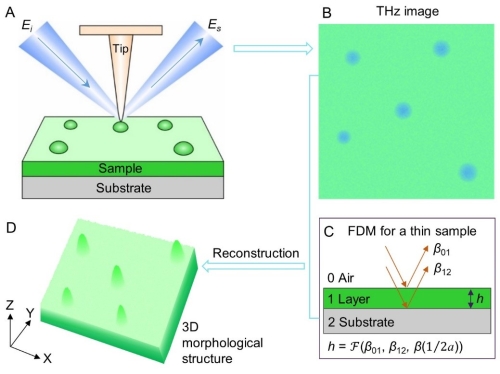 近日,中国科学院重庆绿色智能技术研究院(以下简称“重庆研究院”)王化斌研究员团队和上海大学材料生物学研究所李江教授等团队合作,报道了一种同时具有表面和亚表面探测能力的纳米级分辨太赫兹形貌重构显微技术。在本工作中,研究团队发展了多介质层有限偶极子近场理论模型,建立了基于样品太赫兹近场光学显微图像来重构样品三维形貌的方法,实现了单个蛋白分子、蛋白网状结构、蛋白单分子层和蛋白复合层的精确检测。建立的太赫兹形貌重构显微技术具有无损、无标记的特点;同时具有表面和亚表面检测能力;其侧向分辨率与原子力显微镜相当,垂直分辨率达到0.5 nm。该技术为研究生物分子、功能材料和半导体器件等样品提供了一种全新的重要技术途径。