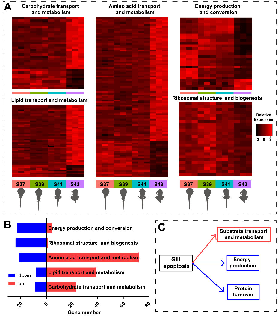 进一步研究发现,在变态高峰期饰纹姬蛙的鳃细胞发生凋亡,代谢底物(糖,脂和氨基酸)增加,然而能量生成和蛋白质转换能力却减弱(图2)。这表明,随着鳃细胞的凋亡,产生的代谢底物并不用于鳃自身的生命活动。与此同时,底物运输能力在这一时期增强,提示这些代谢底物可能被运输至其他组织或器官,为其重构提供必要的能量和物质。