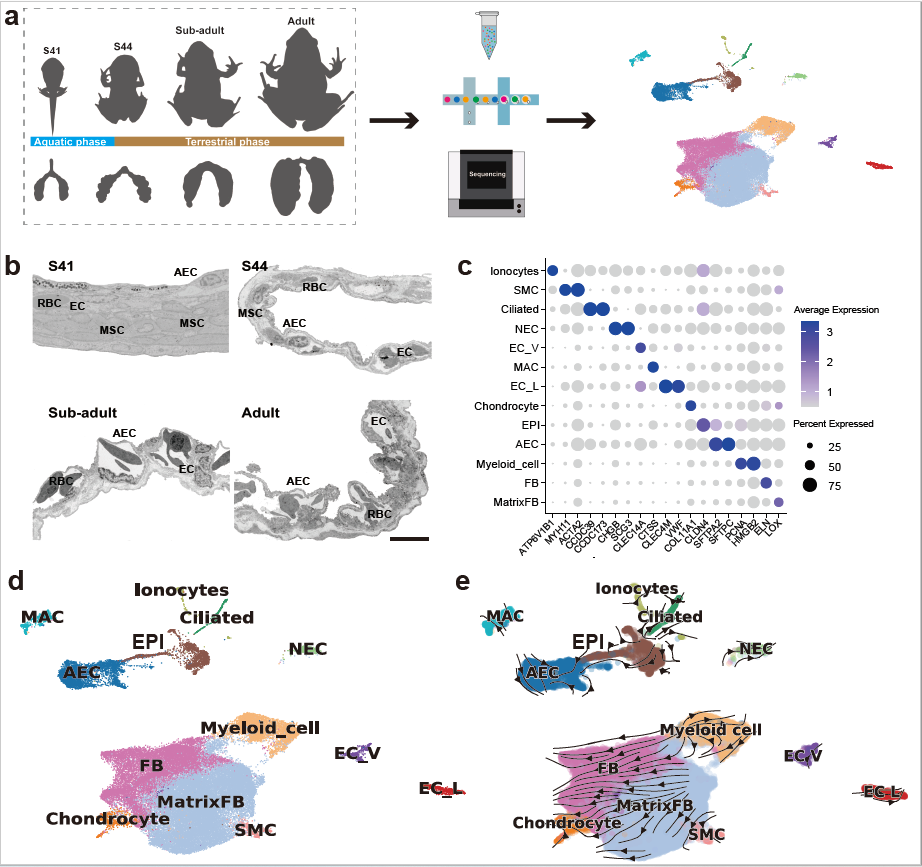 为解决以上科学问题,中国科学院成都生物研究所江建平研究员团队以饰纹姬蛙为研究对象综合采用组织切片、透射电镜、荧光原位杂交、转录组和单细胞转录组等方法技术,通过整合分析多维数据,对饰纹姬蛙变态发育中呼吸器官转变的细胞分子机制进行了深入的探究。