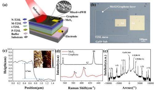 近日,重庆研究院微纳制造与系统集成研究中心在《ACS Applied Materials & Interfaces》期刊上发表了题为“Ultralow-Noise MoS2/Type II Superlattice Mixed-Dimensional van der Waals Barrier Long-Wave Infrared Detector”的研究进展,该论文提出了一种MoS2/II型超晶格混合维范德华势垒长波红外探测器 (Mixed-vdWH) ,利用 MoS2 的高价带势垒有效抑制多粒子扩散。混合势垒使暗电流显著降低了两个数量级,同时在高温下保持了良好的噪声抑制性能。该长波器件在 77 K 时品质因数 (D*) 达到 4×1010 cm·Hz1/2。这种集成策略将二维层状材料的独特性能与传统 3D 半导体材料的成熟加工技术相结合,为其大规模集成提供了一种有前途的策略。