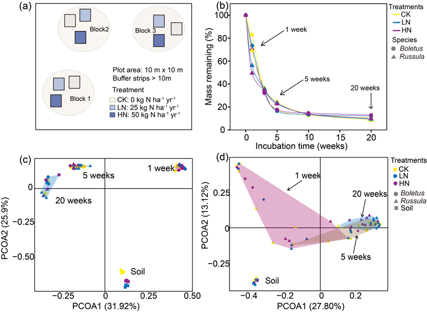 图1 氮添加处理示意图(a)、不同培养时间后ECM真菌残体质量损失示意图(b)以及土壤中和真菌残体上细菌和真菌群落的主坐标分析示意图(c 和 d)。