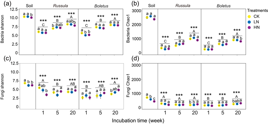 图2 细菌(a、b)和真菌(c、d)群落Shannon和Chao1多样性指数在不同生境(土壤和真菌残体)、不同分解时间和三种氮添加水平下的变化。
