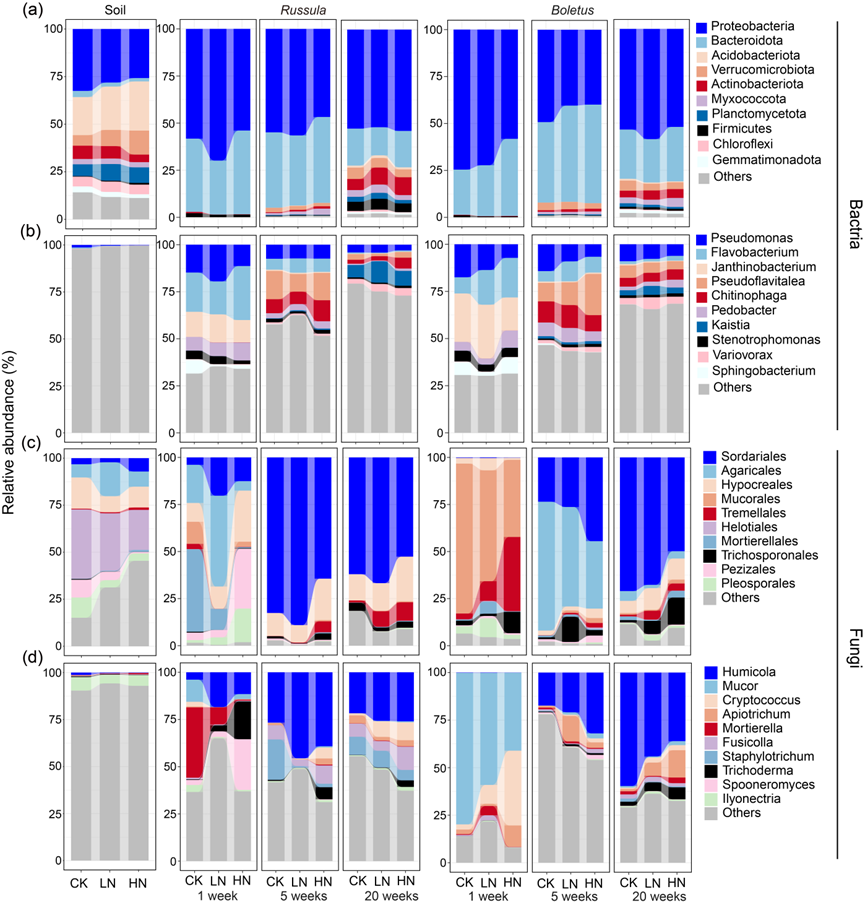 图3 细菌门(a)和属(b)、真菌目(c)和属(d)在不同生境(土壤和真菌残体)、不同培养时间和三种氮添加水平下的相对丰度变化。