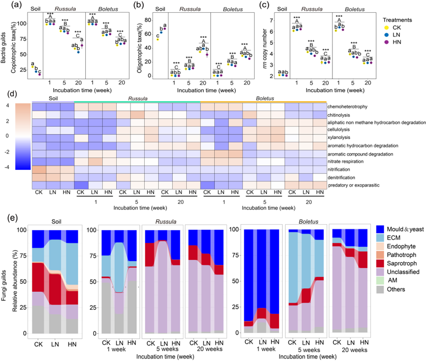 图4 细菌(a-d)和真菌(e)功能群组在不同生境(土壤和真菌残体)、不同培养时间和三种氮添加水平下的相对丰度。