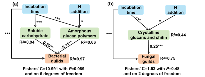图5分解时间和N添加对细菌(a)和真菌功能(b)的影响的结构方程模型。