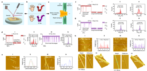 近日,重庆研究院研究人员将纳米孔测量技术和原子力显微成像结合,构建了一种全新的单分子生物物理检测平台,在手性Tau蛋白及其自组装结构精准检测研究中取得进展,相关成果发表在《Materials Today Physics》。研究人员从单分子和拓扑学方向入手,探究了手性转换和肝素对Tau蛋白自组装行为的调控作用。通过清晰地区分不同手性Tau蛋白单体和Tau蛋白自组装纤维结构,发现D-Tau蛋白的自组装倾向大于L-Tau蛋白;肝素会增强Tau蛋白的自组装倾向,辅助不同手性Tau蛋白形成螺旋方向相反、螺距不同的自组装纤维。该研究在分子水平上对手性Tau蛋白单体以及肝素辅助形成的蛋白自组装纤维进行了精确测量与区分,获得了传统方法难以获取的重要的蛋白自组装信息,为研究蛋白结构及蛋白自组装机制提供了新的思路和方法。