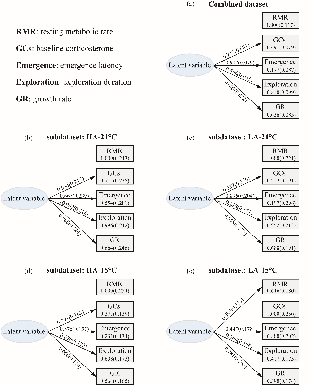 图II 结构方程模型展示不同环境条件下生理和行为特征个体间差异的关联性