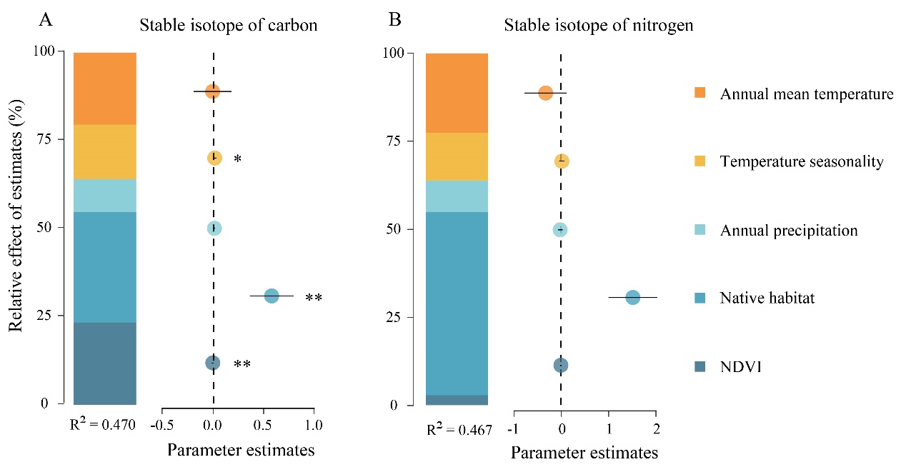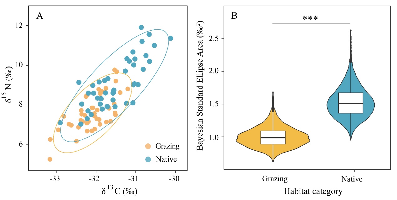 针对上述问题,中国科学院成都生物研究所胡军华研究员课题组结合系统的野外调查和稳定同位素技术,解析了放牧和自然生境下倭蛙(Nanorana pleskei)的营养生态位特征(图3)。倭蛙广泛分布于青藏高原东缘,是连接水陆环境的关键动物类群,与其它陆生脊椎动物相比具有环境依赖性强、流动性较低等特征。研究结果显示,与自然生境相比,栖息在放牧生境中的倭蛙其碳(δ13C)、氮(δ15N)稳定同位素特征均显著降低,营养生态位宽度较窄(图4)。与温度、降水及植被覆盖情况相比,放牧与否对倭蛙营养生态位特征变化的影响最大,生境类型是食物来源和营养级变化的最佳预测因子(图5)。该研究揭示了放牧活动会对高原食物网组成和生态系统营养结构产生重要影响,明确了稳定同位素分析能够为监测放牧对高原湿地的影响提供新的视角,并为制定及评估相关管理和恢复策略提供科学依据。