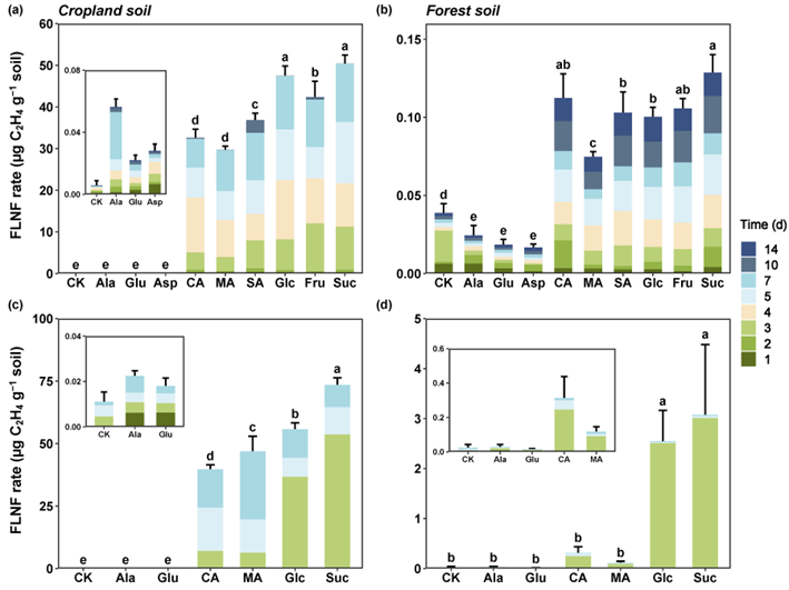 Fig.1 碳源种类对农田(a和c)和森林(b和d)土壤中FLNF速率的影响。
