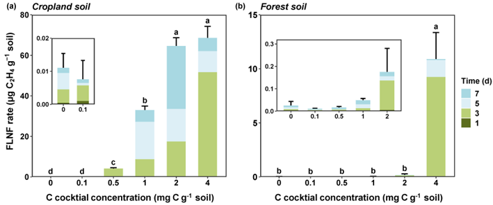 Fig.2 碳源浓度对农田(a和c)和森林(b和d)土壤中FLNF速率的影响。