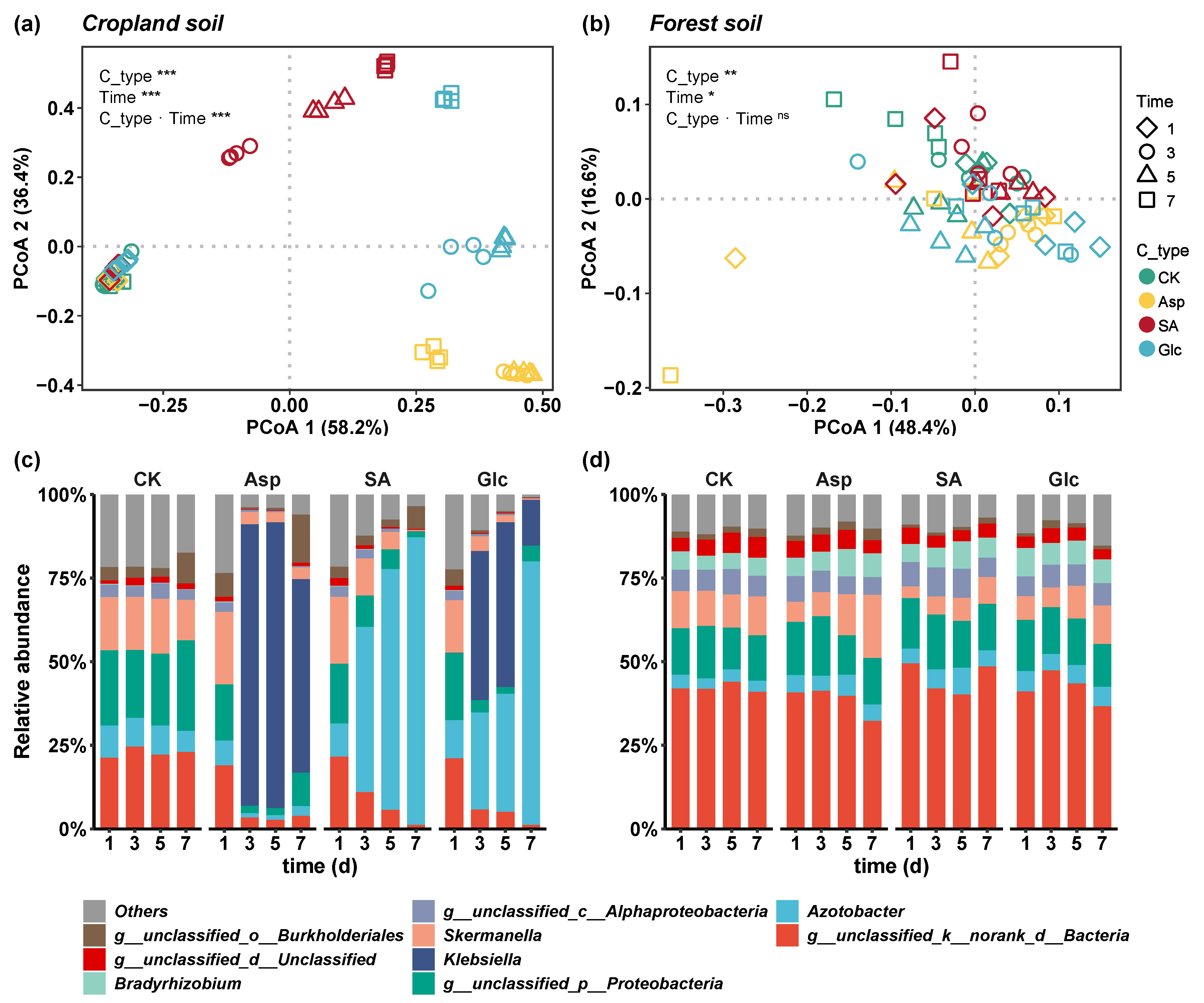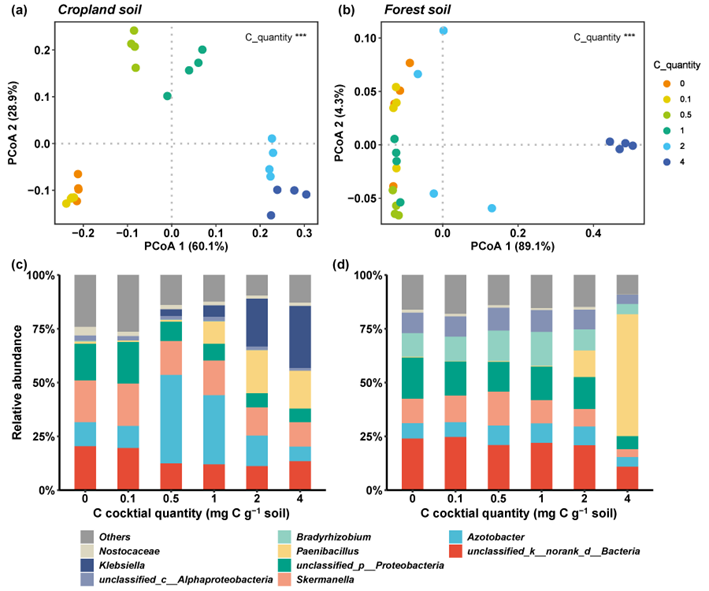 Fig.4 添加不同浓度混合碳源3天后,农田(a和c)和森林(b和d)土壤中非共生固氮微生物群落的主坐标分析(PCoA)及其在属水平的相对丰度。