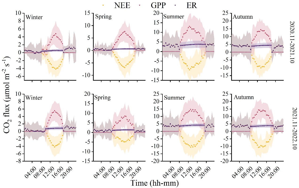 二氧化碳(CO2)作为全球主要温室气体之一,其浓度正以每年2-3ppm的速度迅速上升,近年来更是达到前所未有的水平。随着CO2浓度持续上升,全球气候变暖程度逐渐加剧。截至2019年,全球平均气温水平相比于工业革命前已上升1.1℃,《巴黎协定》敦促各国政府将全球平均气温上升限制在远低于工业革命前水平的2.0℃,并努力将其限制在1.5℃。如何削减二氧化碳带来的温室效应是当下人类社会面临的重要难题,而减少区域碳排放量或人均碳排放量被认为是有效的碳减排途径。中国政府在2020年联合国大会第75届会议上宣布了“双碳”目标,力争在2030年前实现碳排放达峰,2060年前实现碳中和,以促进生态保护和实现可持续发展目标。中国作为全球最大的人工林和天然林资源拥有国,当前正通过森林生态系统的恢复、自然扩张和可持续管理等策略,有效地吸收和储存大量二氧化碳。相关研究表明,中国森林在吸收和固定大气碳等方面发挥了显著作用,在应对气候变化方面具有积极影响。为了准确量化森林碳固存潜力,科学家们正在不断建立更多实地监测站点并生成综合数据集,以评估、模拟并预测不同尺度生态系统碳收支状况。涡度相关方法提供了长期连续的碳通量计算,为模型建立和校准提供了科学基础数据,在城市地区、农田、草地、森林和水体等多种生态系统中得到广泛应用。