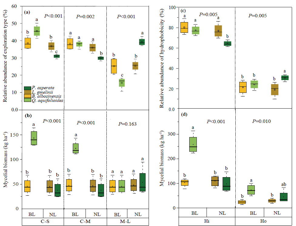 图1. 不同树种基于外生菌根群落探索类型和疏水性能的相对丰度和菌丝生物量