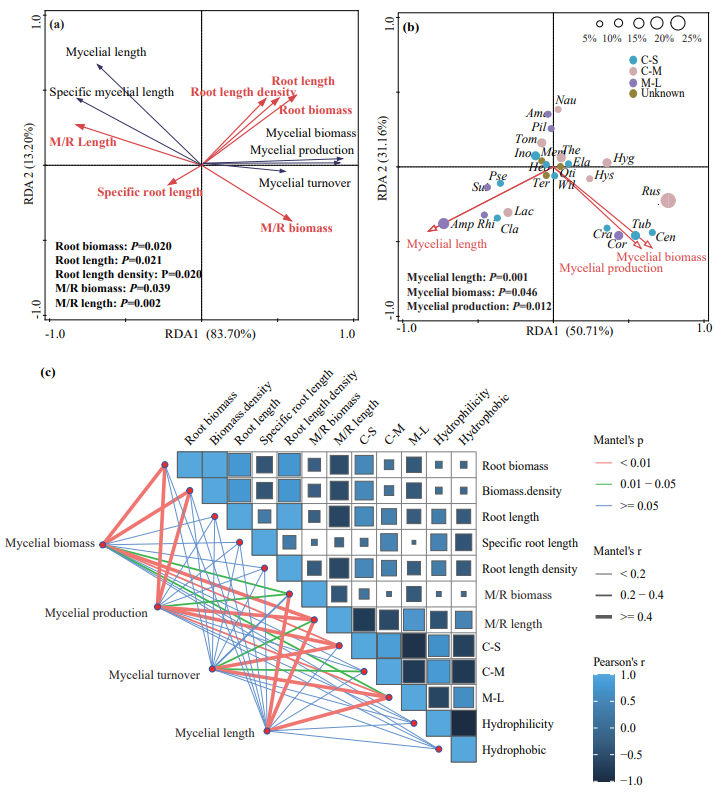 图2. 外生菌根菌丝性状与根系属性变量和外生菌根群落组成的关系。
