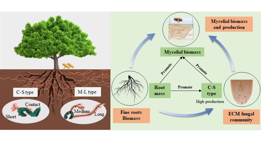 基于此,中国科学院成都生物研究所抗逆植物适应与筛选研究团队博士生谢路路(已毕业)在尹春英研究员的指导下,以西南亚高山四种优势树种:云杉(常绿针叶)、落叶松(落叶针叶)、高山栎(常绿阔叶)和红桦(落叶阔叶)为研究对象,通过菌丝袋填埋和取样,分析菌丝生物量、产出和周转,并结合ECM群落组成(探索类型),探究外延菌丝特征和ECM真菌群落组成随树种的变化规律及二者之间的关系。主要研究结果:1)ECM真菌群落组成在针叶和阔叶、常绿和落叶树种间存在差异:中-长探索类型菌根在常绿、阔叶树种占优势,而短距离和接触型菌根真菌类型在落叶、针叶树种占优势;2)EEM生物量在细根生物量的占比约10%,且树种间无显著差异,细根生物量越大,EEM生物量越大;3)外生菌根菌丝探索类型影响着菌丝产量和周转率:与其他树种相比,高山栎表现出较高的细根生物量、菌丝生物量及产出,ECM群落组成以周转快的接触-短探索型为主;而云杉的菌丝生物量和产出最低,以周转快的中-长探索型为主。该结果证明了ECM 真菌探索类型在估算菌丝生物量、乃至森林碳汇和碳储存的重要性。