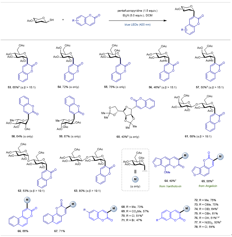 香豆素类衍生物C-H糖基化:通过该策略,作者成功实现了对香豆素类天然产物分子选择性C3位糖基化修饰,制备了一系列结构多样性的香豆素C-糖苷。在最优条件下,作者对巯基糖底物范围进行了拓展研究,发现该反应具有良好的官能团兼容性。对于大部分单糖和二糖,都能够以非常高的立体选择性得到目标产物。例如,葡萄糖(53)、甘露糖(55)、2-氨基半乳糖(57)、乳糖(61)以及纤维二糖(63)等。装载了各种取代基的香豆素底物也能够很好的兼容反应。例如,甲基(68)、酯基(69)、卤素(70, 78)和氨基(77)以及游离羟基(76)等官能团。