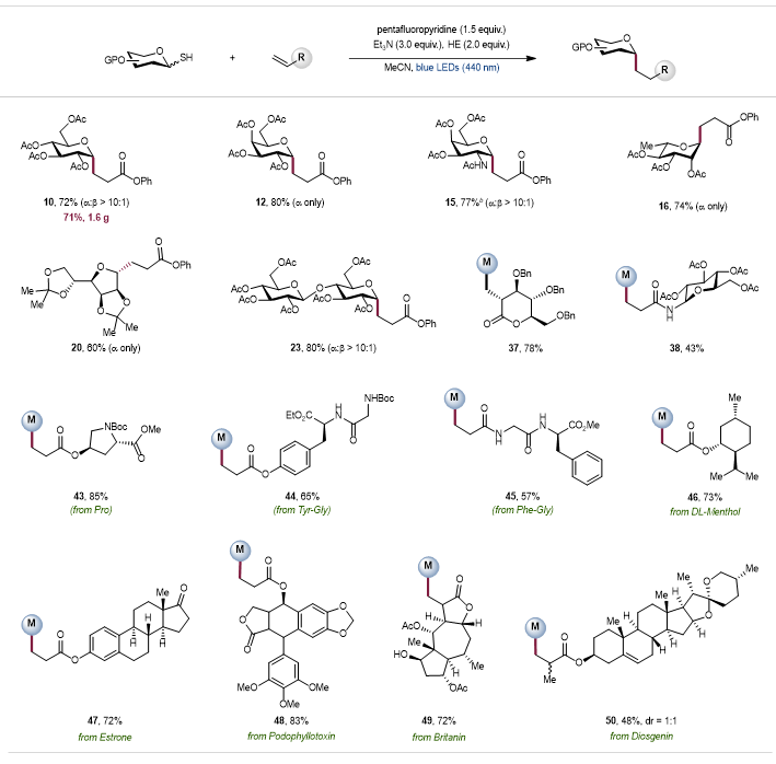 合成C-烷基糖苷:与此同时,作者通过对反应条件的调整(加入Hantzsch酯),以烯烃作为糖基受体,可得到C-烷基糖苷。在该反应条件下,作者对不同类型的巯基糖和烯烃受体适用范围进行了考察,结果显示不论是单糖(10, 15)、二糖(23)还是糖(37)、氨基酸(43)、多肽(44, 45)以及复杂天然药物分子(48, 49)衍生的烯烃受体均能兼容该反应,以中等至较好的产率和优异的立体选择性得到所需的C-烷基糖苷。