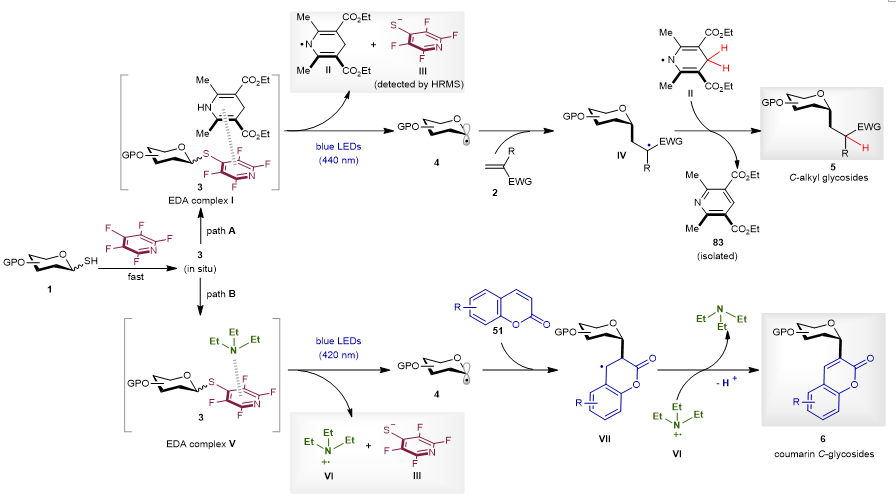 为了阐释反应机制,作者进行了一系列机理实验,例如自由基捕获实验、控制实验、Light-on-off实验、UV实验以及氘代实验等。通过对实验结果的分析,作者提出了该反应可行的反应历程。对于C-烷基糖苷的制备,按照路径A,原位生成的吡啶S-糖苷3和Hantzsch酯形成EDA络合物I,在蓝色LED的照射下,激发态EDA络合物I发生光诱导的单电子转移,产生糖基自由基4,伴随着N-自由基物种Ⅱ的形成和芳基硫负离子III的离去。糖自由基随后被烯烃受体捕获产生一个新的烷基基团IV,随后被II氢化,得到所需C-烷基糖苷5。此外,对于香豆素C-糖苷的制备,按照路径B,吡啶S-糖苷3和Et3N将形成EDA络合物V,在蓝色LED的照射下,从激发态V发生单电子转移,产生糖自由基4和Et3N+• VI。糖自由基随后被香豆素捕获以产生新的烷基自由基VII。已证实三乙胺(Et3N+•)可以作为单电子氧化剂(Et3N: E1/2Ox = 0.78 V vs. SCE),因此,随后VII经过单电子氧化(by Et3N+•V)和脱氢(by Et3N)得到香豆素C-糖苷6。