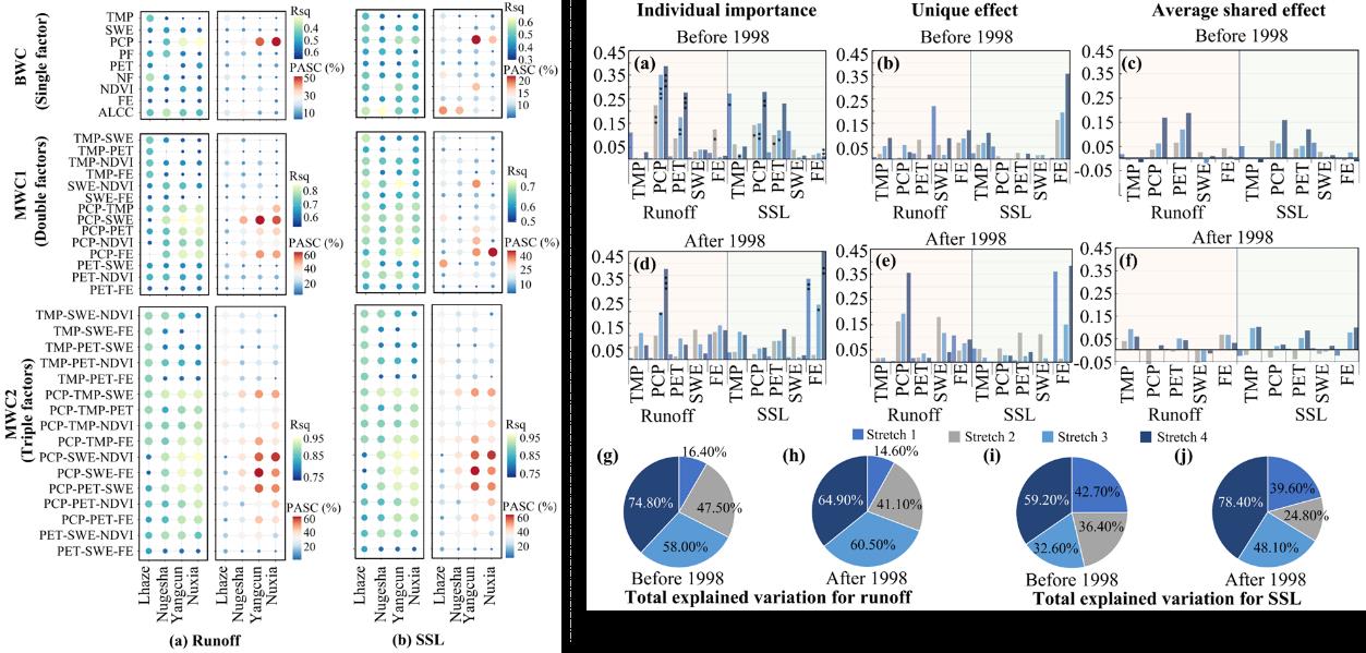 研究表明,流域内各水文站径流量普遍呈上升趋势,但河流输沙量却呈现明显的空间异质性:下游悬浮输沙量正以每年12.3×104 t/yr速度显著降低,中上游悬浮输沙量则呈上升趋势;各河段泥沙输送的贡献差异明显:拉孜-日喀则段贡献了约80%的泥沙量,成为主要的泥沙来源区;羊村-奴下段悬浮泥沙以沉积为主,捕获了上游河段约17%的泥沙量;归因结果发现,气温与积雪的协同作用在一定程度上缓解了流域上游降水减少对径流与输沙的影响,但在流域中下游则显著加大了降水增加对径流量的影响;植被减流减沙效益具有明显的尺度依赖性:羊村站在整个研究周期内植被与水沙通量之间表现为持续的负相关,奴下站在1985-2005年间的1~2a和6~10a周期内也呈现显著的负相关关系;而奴各沙站(1960-1996年)和拉孜站(2000-2020年)在1~2a周期内则表现出显著正相关。进一步分析显示,1998年前气候变化(尤其是温度升高和降水变化)主导了流域径流和悬浮输沙量的变化,1998年以后,降水量的增加仍是下游河段径流增加的主要驱动因素,植被恢复是下游泥沙量减少的主要驱动因素。