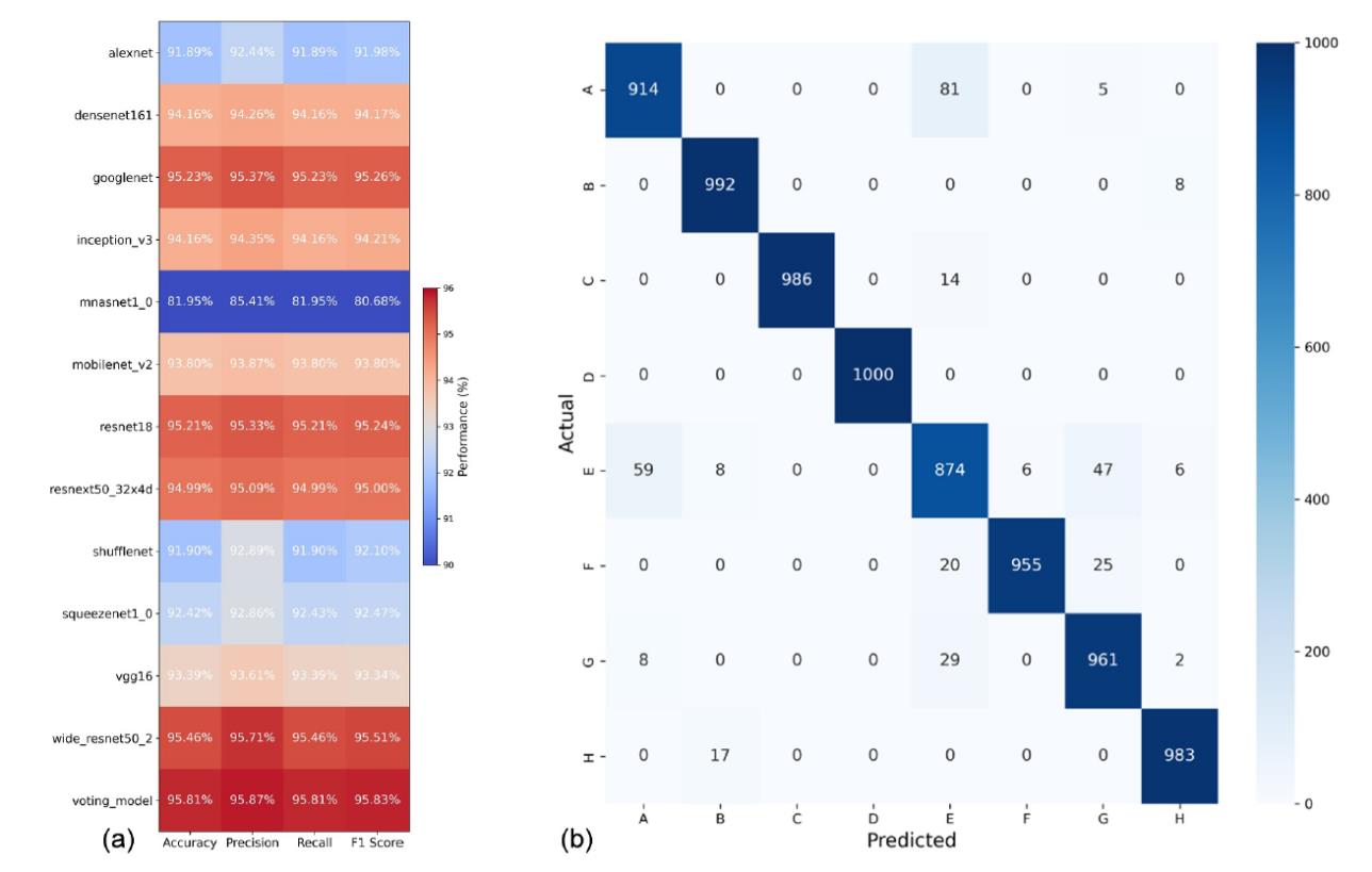 模型测试结果:(a)按准确率、精确率、召回率和F1分数对多目标分类评估的热力图。(b)使用投票分类器后多目标分类的混淆矩阵。A~H依次代表水流、泥石流、经幡、自然沟壑、行车行人、落石、植被、动物(牦牛为主)