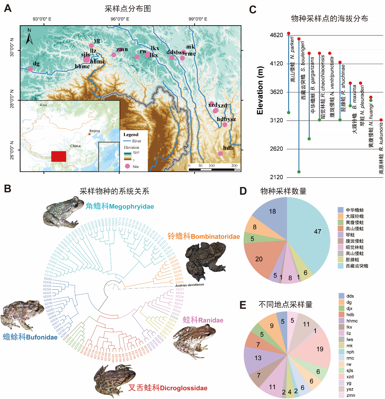 图1 青藏高原科学考察两栖动物样本信息。(A) 采样点位置。(B) 119个样本的系统发育关系。基于119个两栖动物样本线粒体基因序列拼接构建的系统发育树,使用IQ-TREE软件并进行1000次bootstrap重复分析,不同物种以不同颜色的分支表示。(C) 10种两栖动物的采样点海拔范围。绿色和红色点分别表示采样点的最低和最高海拔。(D) 两栖动物样本的物种分布。饼图展示了来自不同两栖动物物种的样本数量,不同颜色代表各个物种。(E) 两栖动物样本的采样点分布。饼图展示了从不同采样点采集的两栖动物样本数量,不同颜色代表各采样点。
