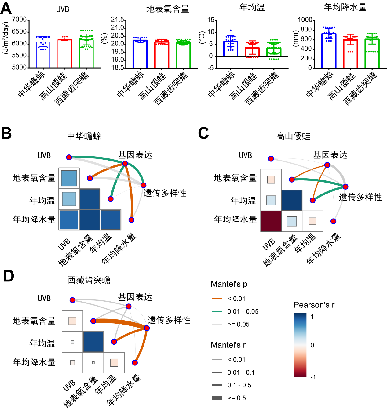图2 基因表达变异、遗传多样性与环境因子之间的关联(针对三种高原优势物种)。(A) 三种高原优势物种的环境因子变化情况。(B-D) Mantel分析分别展示中华蟾蜍(B)、高山倭蛙(C)和西藏齿突蟾(D)的基因表达、遗传多样性与环境因子之间的相关性。线条的粗细表示相关系数(r)的大小,线条颜色反映显著性水平(p值),而方块颜色代表皮尔逊相关系数(r)。