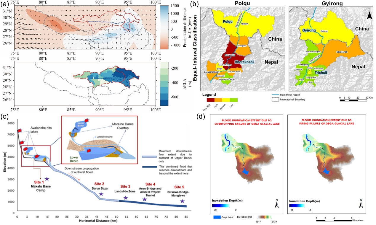 (a)雅鲁藏布江末次冰盛期与工业革命前的季风降雨和物质平衡线高度变化;(b)波曲-布特科西河和吉隆-特里苏利河跨境流域冰湖溃决风险;(c) 上巴伦湖和下巴伦湖级联溃坝和溃决洪水传播过程;(d) 喜马拉雅东构造结那木拉错冰湖溃决洪水情景模拟