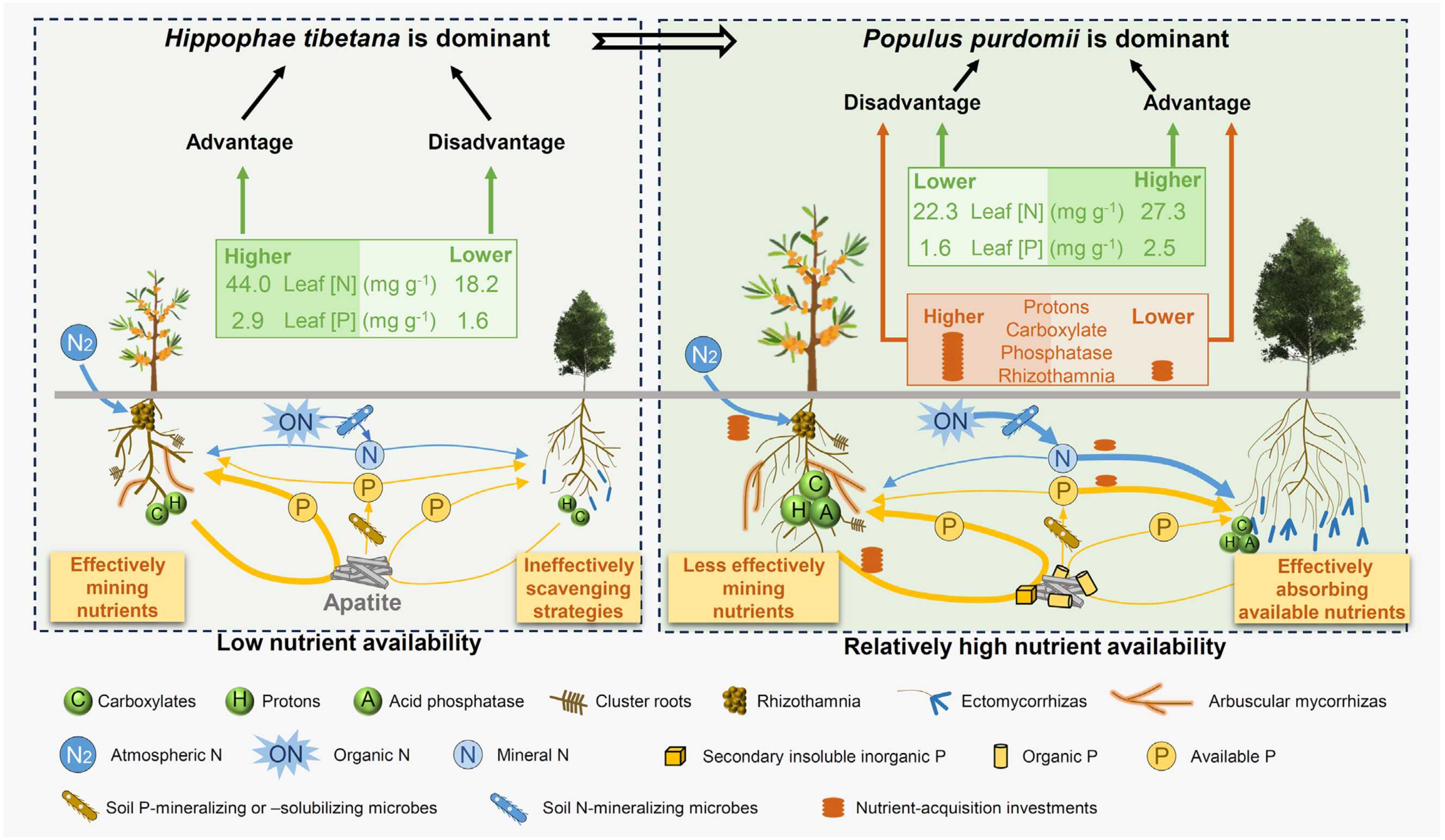 植被原生演替机制是生态学的核心科学问题。原生演替过程中,植物物种组成和土壤养分协同变化。植物养分捕获策略(nutrient-acquisition strategies ,NAS)是连接土壤养分和植物生长的关键性状,对演替过程具有重要驱动作用,但其中的机理一直未被揭示。中国科学院成都山地研究所山地养分循环与生态功能提升团队针对贡嘎山冰川退缩区植被原生演替序列冬瓜杨替代沙棘的过程展开研究,揭示了植物NAS对原生演替过程中物种更替的关键驱动机制。