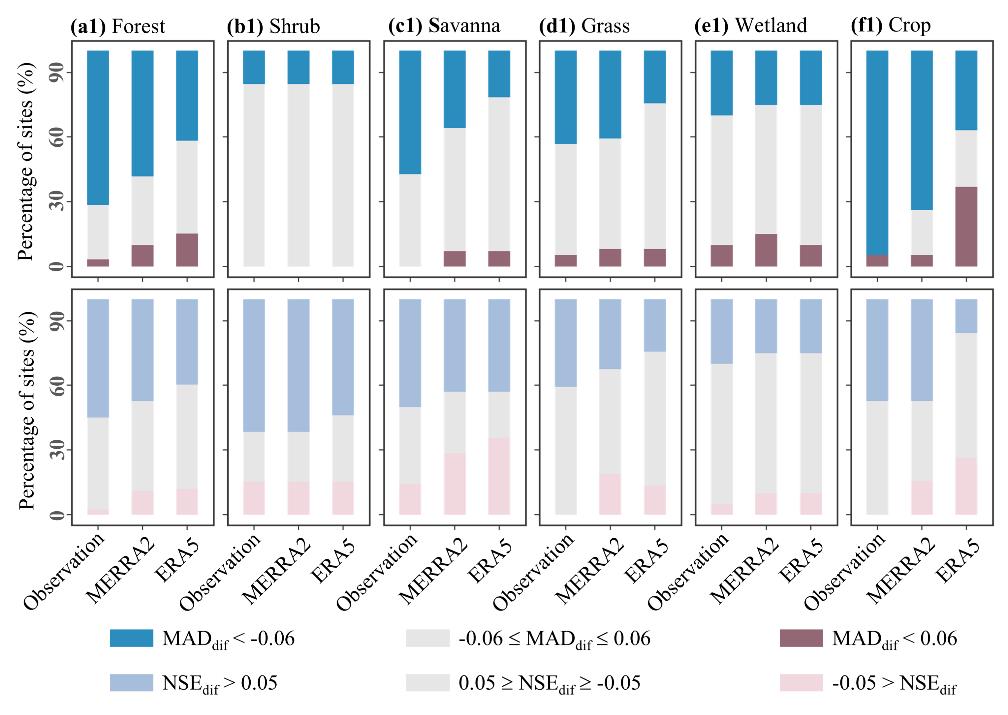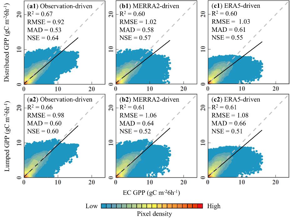 为解决这一问题,成都山地所谢馨瑶副研究员团队以全球194个FLUXNET站点为样本,结合再分析产品(MERRA2和ERA5)与站点观测数据,深入探讨了气候数据引起的时间尺度不确定性。研究发现,在1小时时间尺度下,由再分析数据驱动的GPP与站点观测数据之间的相关性较弱,而观测数据驱动的GPP则表现出更强的相关性。进一步分析发现,辐射引起的不确定性显著高于温度和VPD带来的不确定性。在6小时时间尺度下,集总式GPP(基于6小时气候数据建模)表现较差,而分布式GPP(基于1小时气候数据建模)与站点数据更加吻合(MAD降低0.06 gC m-26h-1,NSE提高0.05)。这表明时间分辨率对估算精度有显著影响,且忽略时间波动会加剧GPP估算误差。通过评估气候波动引起的时间尺度误差,本研究为理解全球气候变化对陆地生态系统碳循环的影响提供了新的研究框架。