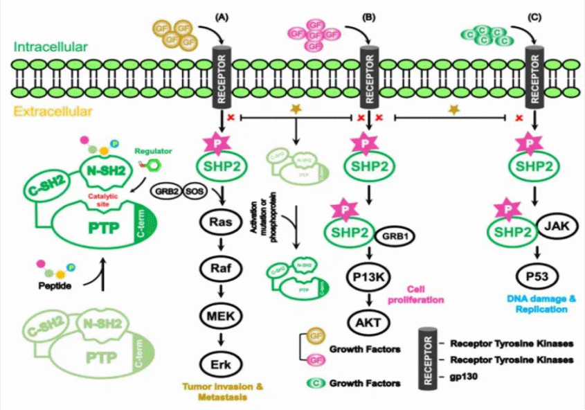 图. 蛋白酪氨酸磷酸酶(SHP2)参与多项信号通路