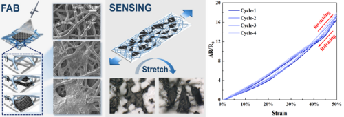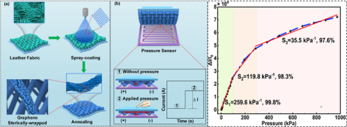 喷涂构筑微纳共形力敏结构,制备大量程高灵敏度柔性传感器。针对柔性传感器微纳力敏界面难以可控制备致使器件灵敏度与量程不可兼得的技术瓶颈,团队基于低成本、高效可控的雾化喷涂工艺,提出微纳共形力敏结构的喷涂制备新方法,发展力敏导电层在三维微纳结构表面的大面积可控沉积技术,实现了MPa级大量程高灵敏度柔性传感器的可控制备,显著降低了对高端微纳加工设备的依赖与制造成本,具备良好的工艺可扩展性与大面阵潜力,并适配多种柔性基材与异形曲面。相关成果以“Graphene sterically-wrapped textile piezoresistive sensors: A spray coating path for synergistically advancing sensitivity and response range”为题发表在《Chemical Engineering Journal》。