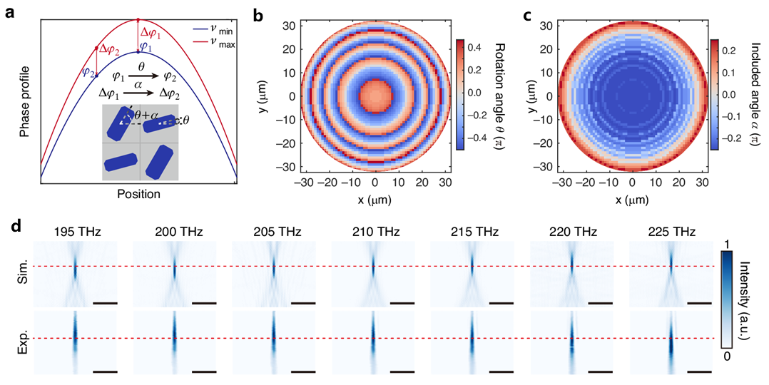 基于该原理设计的超构表面能实现新颖的功能,例如仅通过调控结构旋向实现宽带消色差聚焦和消色差自旋霍尔效应,以及单个超构表面生成时空矢量光场。如图3所示为仅通过调控结构旋向实现宽带消色差聚焦,该超构透镜与以往依赖改变纳米柱尺寸的消色差超构透镜不同,每个晶格的唯一设计参数是纳米柱的旋向角。如图3(a)所示,纳米柱的旋向角θ主要被用来以几何相位原理实现聚焦相位,而旋向角的差值α用来调控色散,使各频率的波前符合理想聚焦相位。图3(b)和(c)展示了旋向角θ和α的空间分布。图3(d)对比了数值仿真与实验测量的xoz截面光强分布,展现出该超构透镜具有连续宽带消色差聚焦能力。