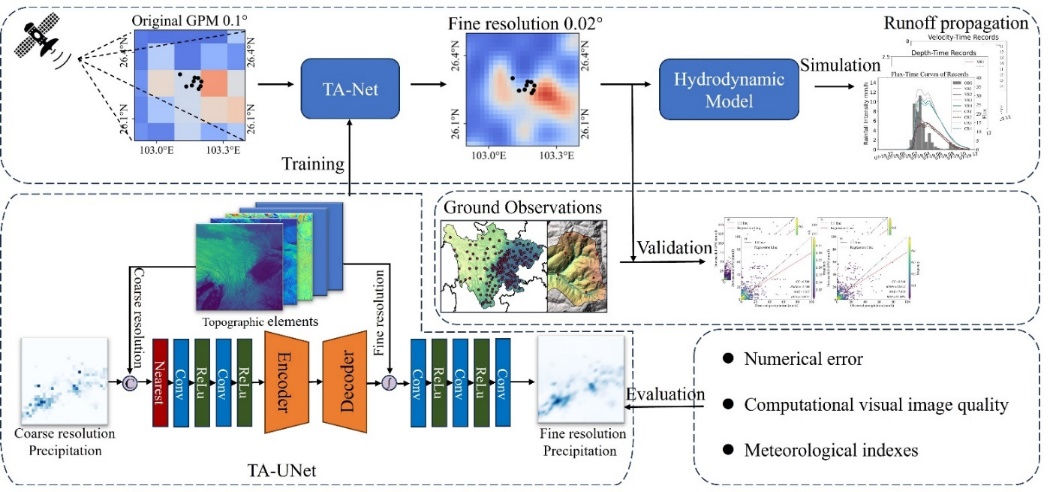 针对上述问题,成都山地所何思明研究员团队博士研究生简继皓提出了一种基于卫星降水降尺度的流域降水-径流精细化模拟方法,该方法耦合局地降水降尺度模型和水动力数值模型,分析了地形效应影响下流域局地降水模式,构建了基于地形注意力机制的TA-UNet (Terrain-based Attention U-Net) 降尺度模型,能够有效识别微地形影响下降水空间分布特征关系,完善了一套针对卫星降水降尺度模型的系统性评估方法,实现了从卫星降水预报到流域径流的全过程模拟。
