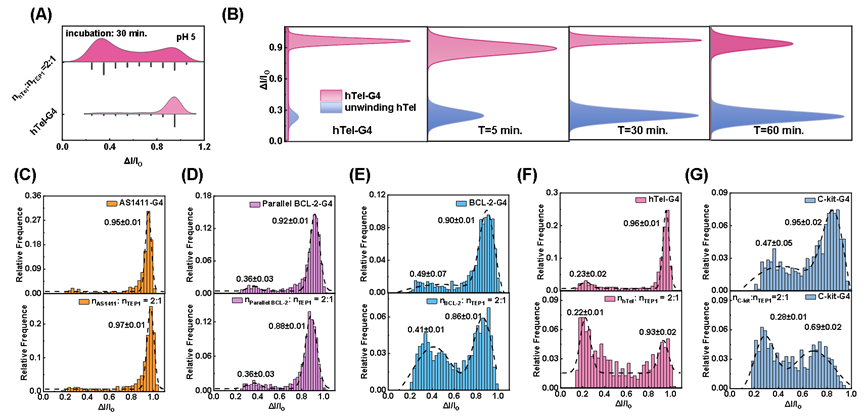 在核酸-蛋白质相互作用研究方面,研究团队采用固态纳米通道单分子平台,首次实现了对DNA/RNA G4被特定蛋白质(TEP1、RTEL1、nsp13)实时解旋过程的直接监测(图1)。该研究成功观测到20 nM人体端粒序列DNA(hTel)在弱酸性条件(pH 5),0.5 M CsCl缓冲介质中,可被10 nM TEP1或RTEL1蛋白在1小时内高效解旋为单链DNA(ssDNA)。TEP1蛋白展现出对混合型拓扑结构G4的选择性解旋能力,而对平行型G4作用甚微(见图2)。在SARS-CoV-2病毒RNA 研究方面,实验证实来源于病毒基因组的RNA G4结构(如RNA-1574)可在2 M LiCl、pH 5条件下,被其解旋酶nsp13高效解链, 50%摩尔比的nsp13在1小时内即可实现RNA-G4显著解折叠。该技术为理解G4结构在端粒维持、肿瘤发生及病毒复制等关键生物学过程中的作用机制提供了全新的单分子研究工具。