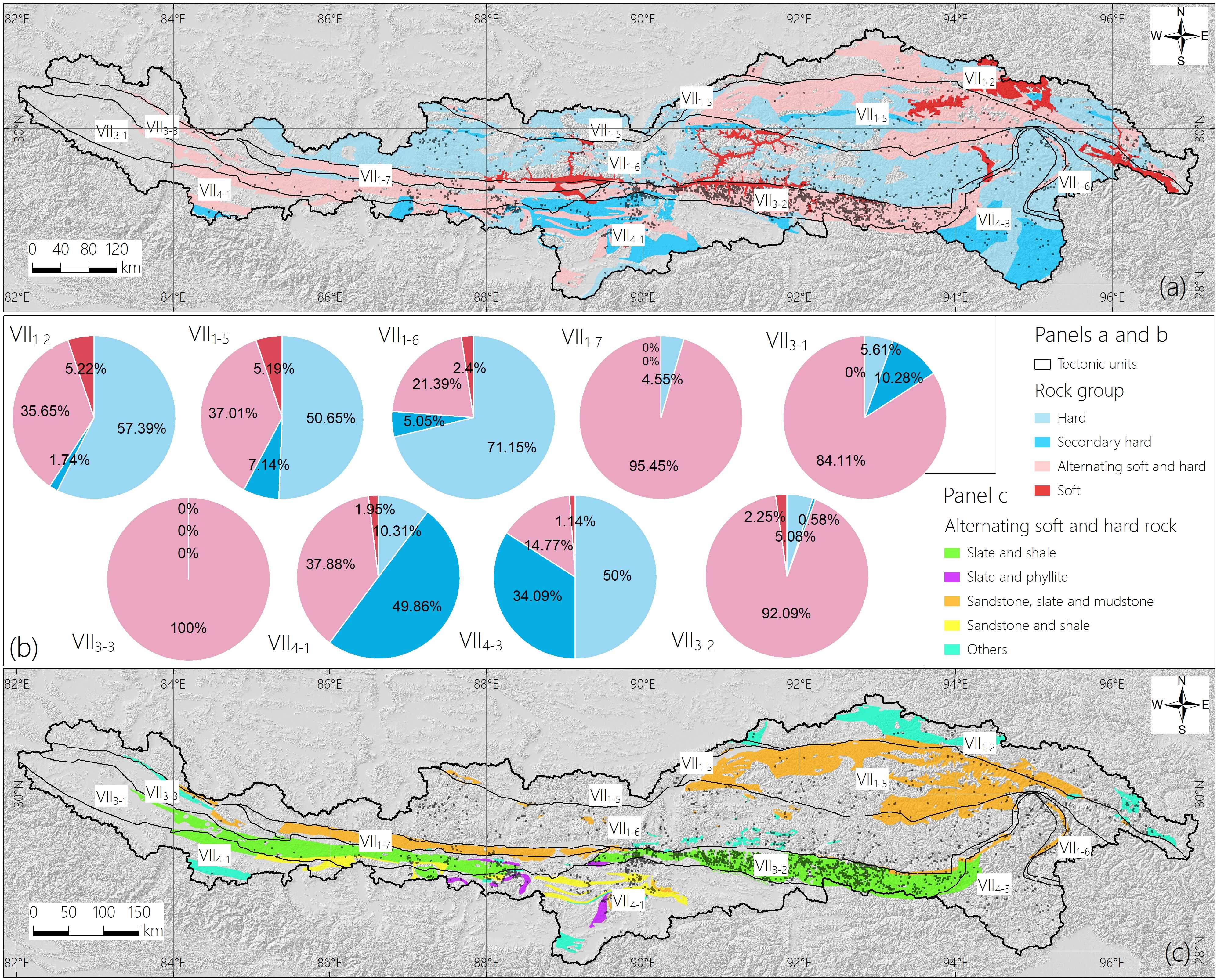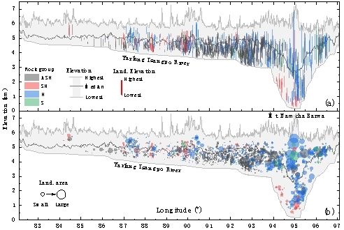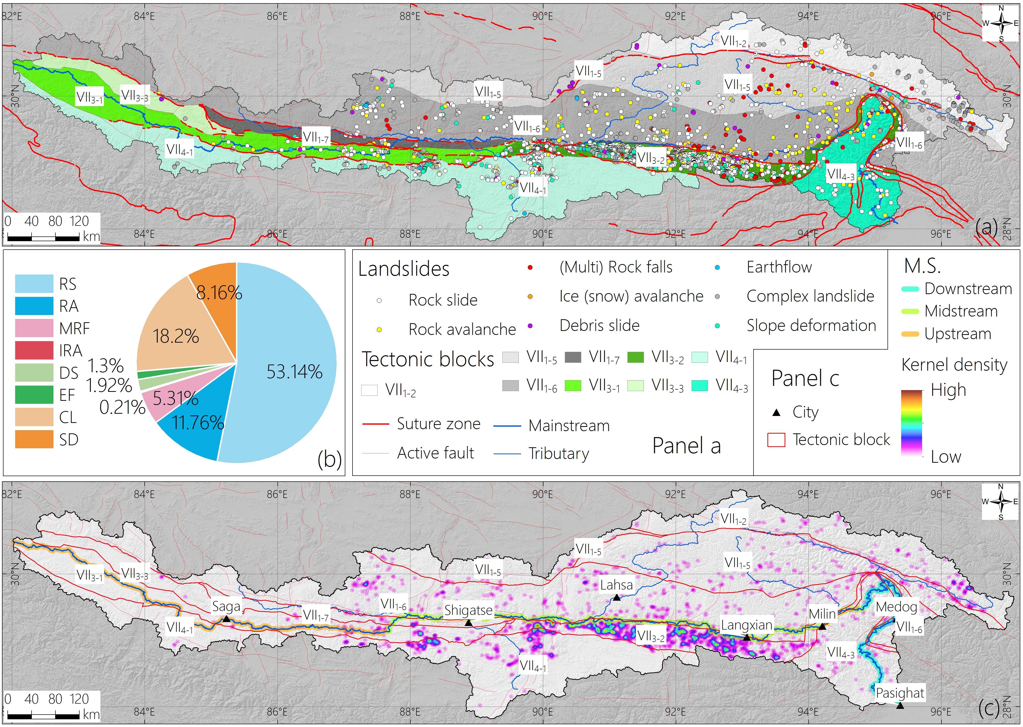 雅鲁藏布江流域位于印度板块和欧亚板块碰撞带,是全球地质构造和地形地貌最为复杂的地区之一,同时,强烈的隆升和剥蚀作用使得雅鲁藏布江流域成为地表起伏最为剧烈的区域之一,岩体破碎、地震频发,这些使得雅鲁藏布江流域成为滑坡的易发区、高发区,但该流域长期以来缺乏系统的滑坡研究。因此,分析该流域大型滑坡空间分异格局特征及驱动控制要素,可以为该流域滑坡和地貌演化研究提供科学依据。为此,成都山地所苏立君研究员团队,通过系统遥感解译与野外调查分析,对该科学问题展开研究。
