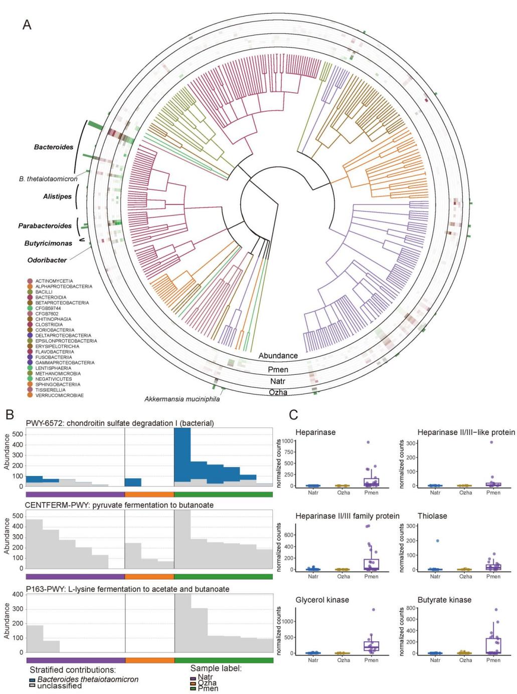 图3. 勐腊钝头蛇肠道菌群构成及功能特化。