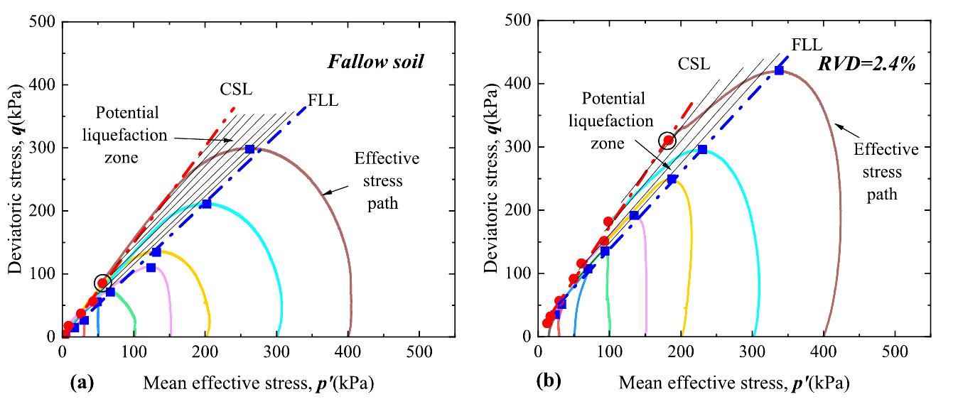 针对上述问题,研究团队构建了室内三轴剪切实验体系,选用杉树根系与砂土混合构造复合材料,设计了五级根系体积密度(0.8%400 kPa)组合,系统开展96组CD/CU路径三轴试验。结果表明:(1)根系形成土体内部“微纤维网”结构,显著提升峰值与残余抗剪强度;(2)在不排水条件下,有效抑制孔隙水压力积聚,使砂土脆性指数下降近50%,抗液化性能显著增强;(3)临界状态线整体随根密度抬升,且呈现应力路径依赖性,首次实验证实根-土复合体的临界状态行为受应力路径影响。