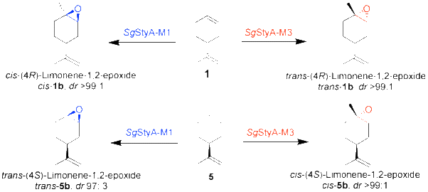 这些突变体不仅对(R)-(+)-柠檬烯表现出优异的立体选择性,对(S)-(-)-柠檬烯也显示出互补的立体选择性,从而实现了四种手性纯柠檬烯-1,2-环氧化物的高效制备(图3)。