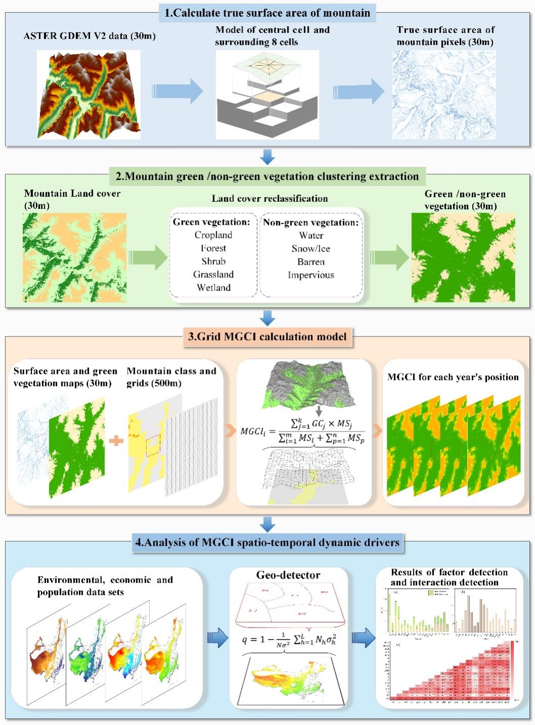 团队进一步创新性地构建了首个兼顾山地真实三维曲面特性的SDG15.4.2指标山地绿色覆盖指数(MGCI)估算模型。该模型改变了以往基于平面投影面积计算山地指标的局限,显著提升了评估的准确性。基于此模型,团队综合利用多源卫星遥感产品与地球大数据技术,成功实现了我国2000至2022年共23年间MGCI的长时间序列、高空间分辨率动态监测。监测结果显示,我国MGCI整体呈现稳定向好趋势,从2000年的78.15%提升至2022年的82.23%,年均增长率为0.18%。团队还深入分析了其时空格局演变规律与驱动机制。研究发现,该指标的改善区与极少量的退化区在空间上呈现异质性分布,且其变化与海拔、水热梯度密切相关。这一数据为联合国2030年议程的中期评估提供了重要的中国案例与数据支撑。