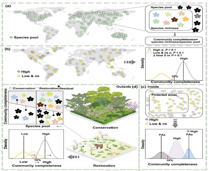 研究揭示了完整性阈值的生物群系差异,系统评估现有自然保护区网络的成效,提出约10%的适生物种(即物种库的约10%)可以作为判定自然保护区有效性的基准,发现全球约41%的重要生态区需要扩大自然保护区范围,实施生态工程有利于提升植物群落完整性。