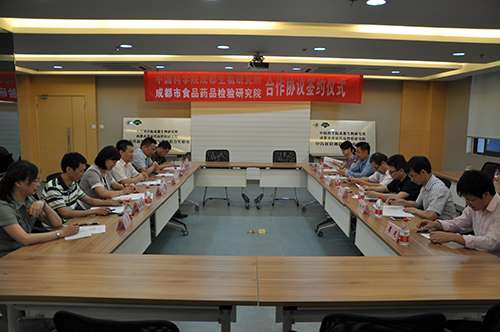 成都市食药管理局食品安全总监蒲旭峰,食药院相关部门负责人,成都生物所公共实验技术中心、天然药物室、科技处负责人参加了签约仪式,所长助理唐卓主持会议。