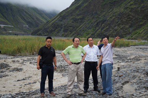 在蒋家沟泥石流堆积滩地听取现场介绍