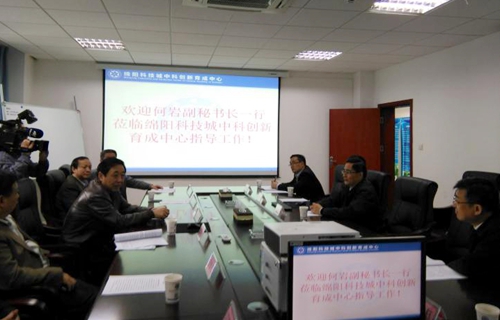 在育成中心,何岩一行考察了中心重点项目展示,并听取了理事会秘书长赵德均关于院地合作的情况汇报以及育成中心关于推进体制机制创新和战略性新兴产业发展的主要工作思路。
