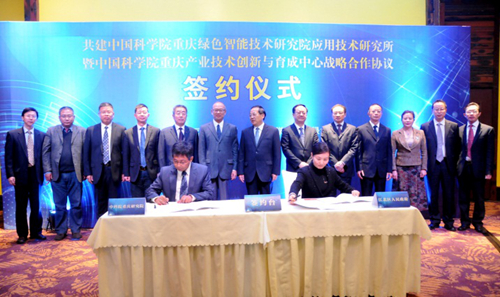 10月31日,中科院重庆研究院与重庆市江北区政府签定战略合作框架协议,共建中国科学院重庆绿色智能技术研究院应用技术研究所暨中国科学院重庆产业技术创新与育成中心。中科院副院长王恩哥,重庆市政协副主席周克勤等出席签约仪式。