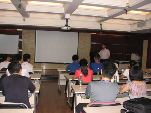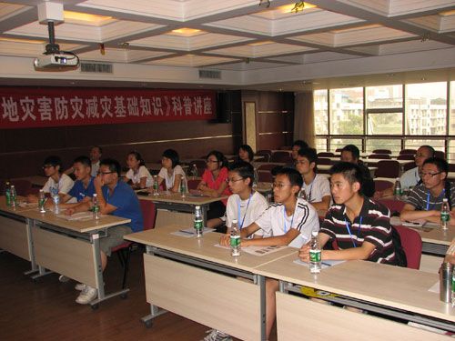在开营的前一天,师生们来到成都山地所参观学习,四川省地理学会常务副秘书长梁娟主持会议,副所长韦方强在首先的讲话中对师生们的到来表示热烈欢迎,并简要介绍了本所的基本概况。随后,谢洪研究员作了题为《山地灾害防灾减灾基础知识》的科普讲座,播放了成都山地所5.12汶川地震抗震救灾纪录片,以及由成都山地所参与制作的中国地质灾害网的有关内容。