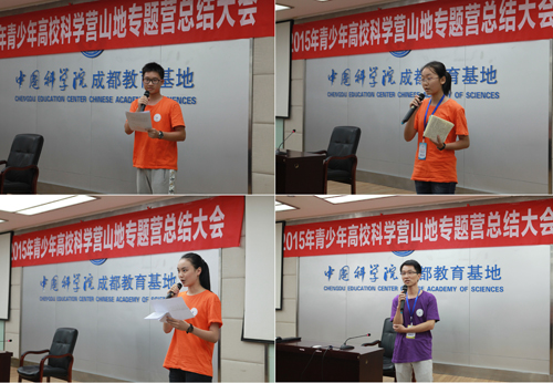 中科院成都山地所科普与学会处副处长张宁代表专题营主办方对同学们在在营期间的表现作了总结,特别被对大家在山地营建立的团结互助、关心他人的品质深深感动,通过专家报告、野外实践、实验室求真、交流互动等活动,展现了大家青春活力的一面,并希望这个活动能激发同学们对科学的热爱和对山地的热爱,真正实现“走进山地,放飞梦想”。