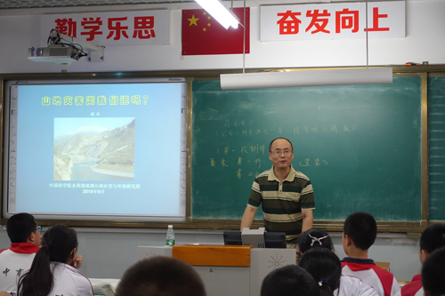 谢洪研究员根据初中学生的年龄和兴趣特征精心准备了讲座课件,从中国防灾减灾日宣传入手,向同学们介绍了山地灾害的类型、特征以及防治方法。讲座选用了大量生动的图片和视频,让大家真实地感受了山地灾害带来的山河破碎和给人类造成的灾难性破坏。讲座中,谢老师还把专业性较强的学术语言转换为形象生动、通俗易懂、诙谐幽默的语言,让同学们更容易理解和接受,大家不时发出惊讶声、赞叹声。
