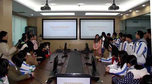 在成都文献情报中心,同学们参观了中心最新科普展览、中文现刊室、电子阅览室以及中国科技网,向同学们开展了生物质能源、纸本阅读到电子读物的变迁等科普宣传。