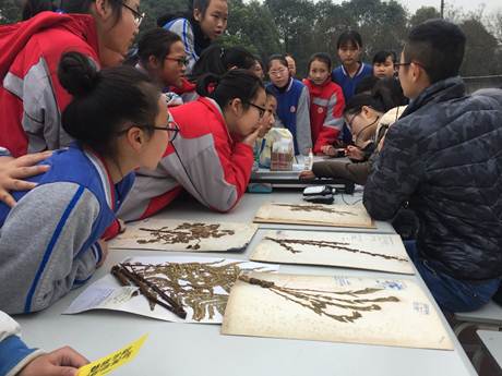 来自成都生物所生态中心和天然药物研究室的科普志愿者为同学们讲解了植物叶片结构及生理功能、植物标本的采集及制作过程。通过植物科普竞答,同学们还赢得了在现场亲手制作植物标本书签的机会。